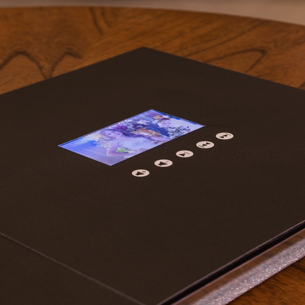 Entre os destaques, chamou a atenção do público o álbum com tela de LCD acoplada, que reproduz automaticamente um vídeo ao ser aberto, trazendo tecnologia embarcada para a preservação das memórias. Além disso, apresentamos novidades em acabamentos diferenciados em toda a linha de álbuns, reforçando nossa vocação para inovação e qualidade.